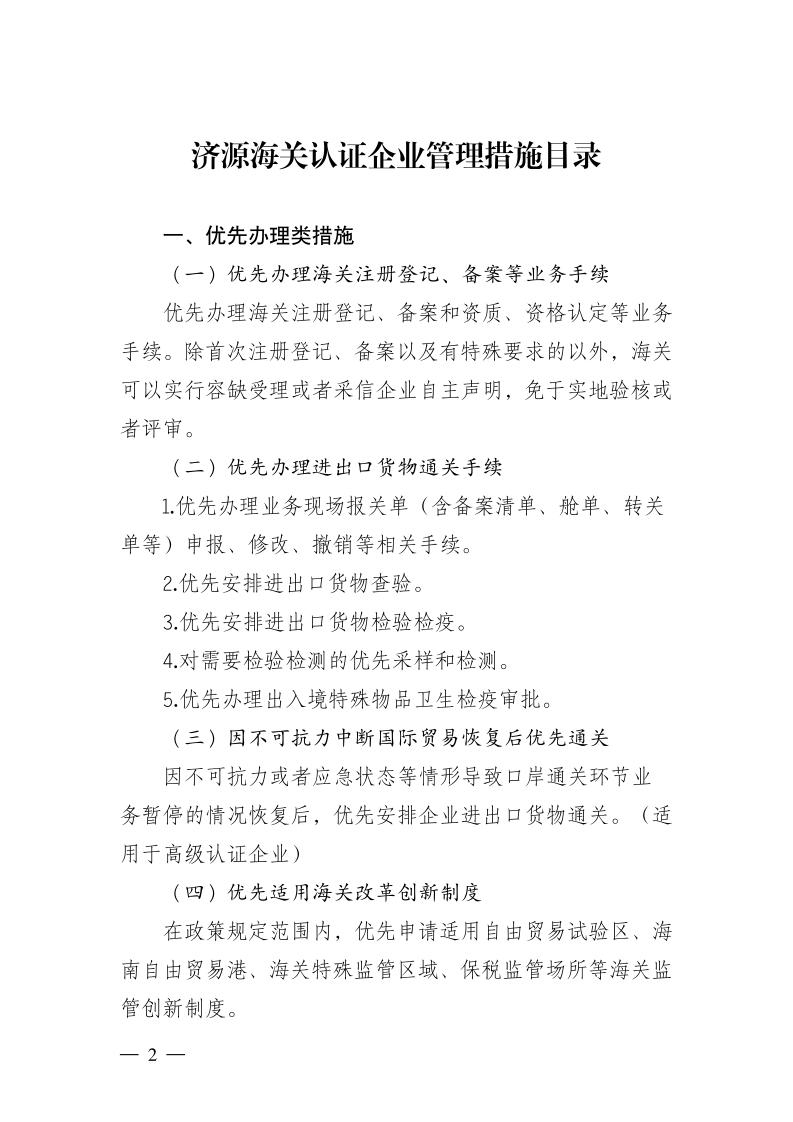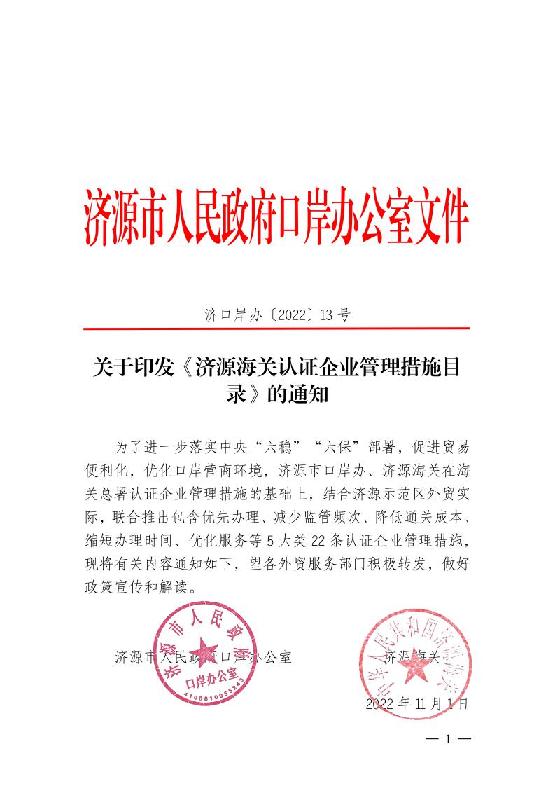 关于印发《济源海关认证企业管理措施目录》的通知